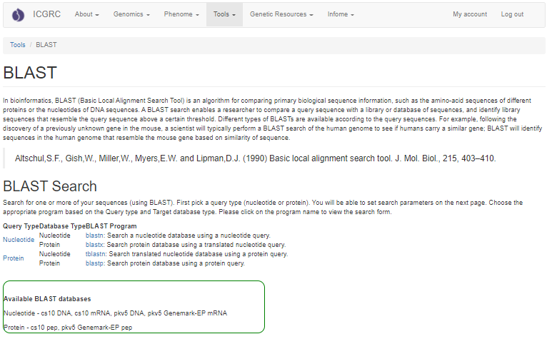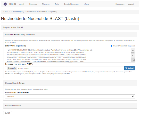 GDC offers BLAST with sequence databases from CBDRx and Purple Kush genome assemblies, predicted transcripts and proteins. The BLAST interface looks and functions like the interface available on NCBI and information on the different settings and how to use BLAST can be found in the BLAST Help manual.  The new Tripal BLAST module displays the results in an interactive alignment user interface.