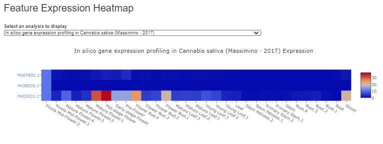 The expression data can also be viewed as a heatmap. To generate a heatmap, a list of feature names needs to be collected and input into the heatmap interface. Paste the list of feature names into the box and click "Display Expression Heatmap". The heatmap will then be displayed on the bottom half of the page.