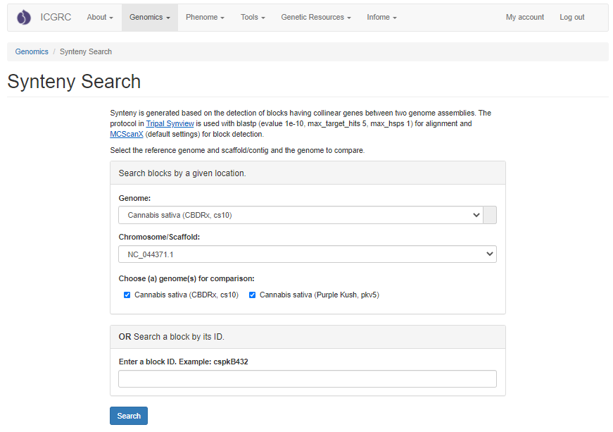 Synteny Viewer, developed by the Fei Bioinformatics Lab, to display the analysis results of genomes that were compared using the program MCScanX.  Synteny Viewer is accessed under the "Genomics" menu.  To get started with Synteny Viewer, first select a genome.  The "Chromosome/Scaffold" menu will then populate with the names of the appropriate scaffolds or chromosomes and one of these sequences can be selected.  The final option is to select one or more genomes for comparison, and then the "Search button" is clicked to start the search.  Alternatively, if the block ID number is already known, the block ID value can be input directly to return just those results.