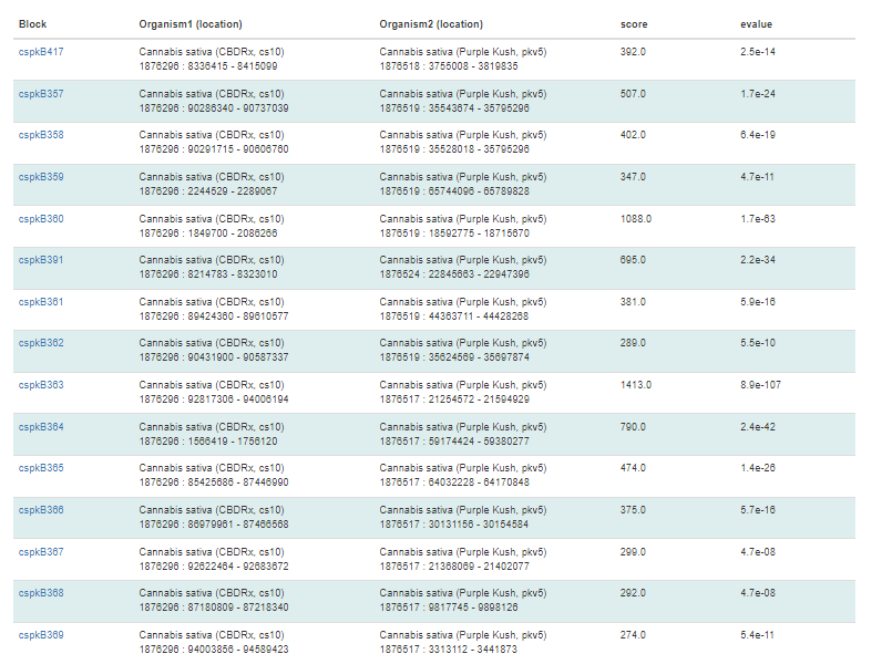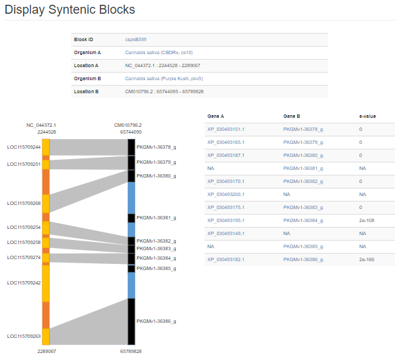 Under the circular graph is a table listing the syntenic blocks that are displayed as gray lines in the circular graph.  Clicking on the block name opens the same details page as clicking on the gray lines on the circular graph.