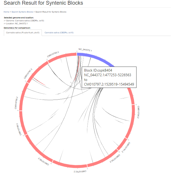 When the search is complete, a new page opens with the results.  There is a summary of the input settings at the top of the page.  When multiple genomes are queried, there are tabs to switch between the results and the circular graph will change when a different genome is selected.  The syntenic regions are indicated on the circular graph by gray lines.  When the mouse hovers over the gray line, a summary is displayed.  Clicking on the gray lines, opens a page with more details.